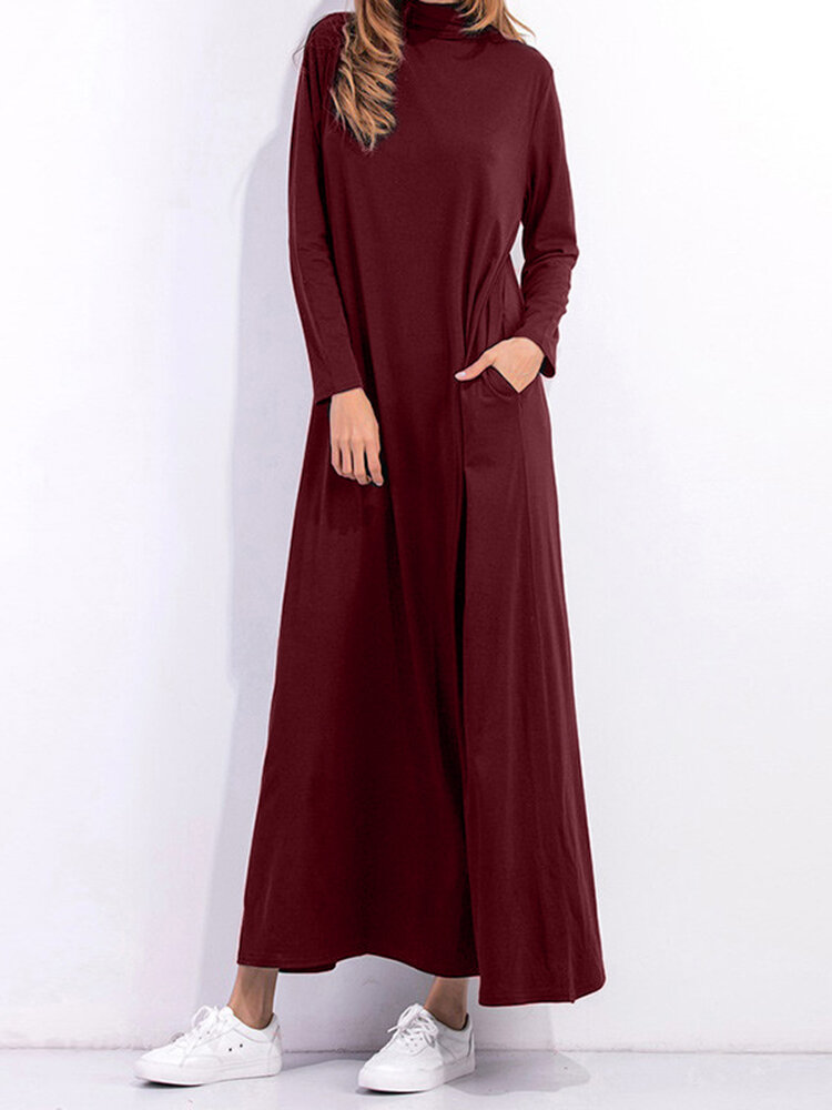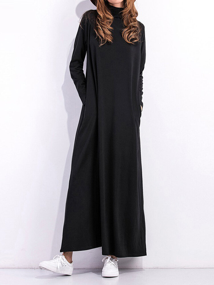• Casual Women Long Sleeve Pure Color Turtleneck Zaklange Jurk