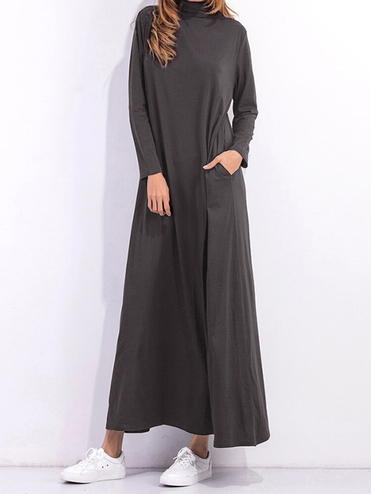Casual Women Long Sleeve Pure Color Turtleneck Zaklange Jurk