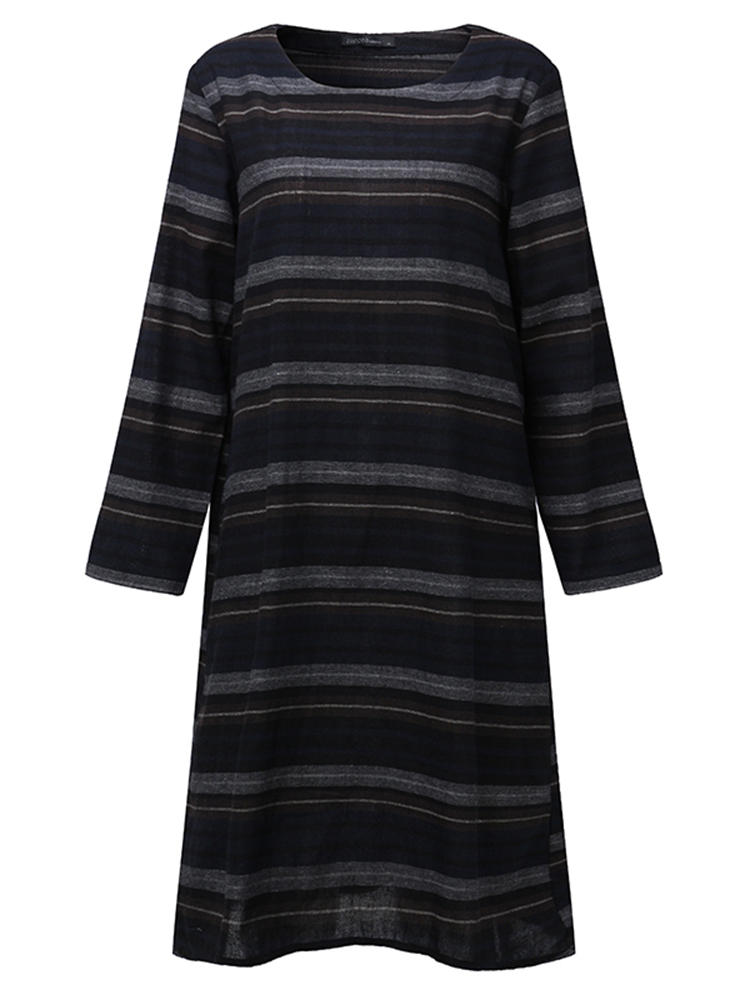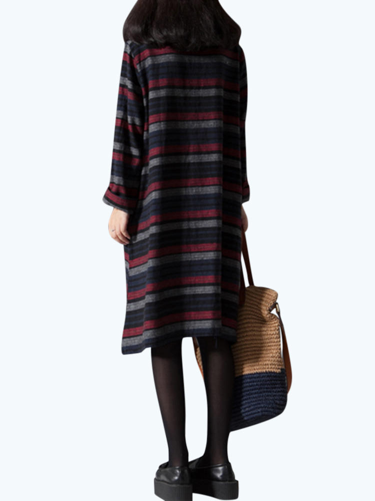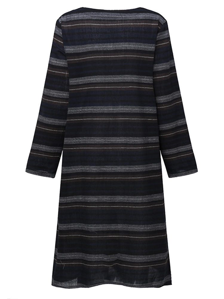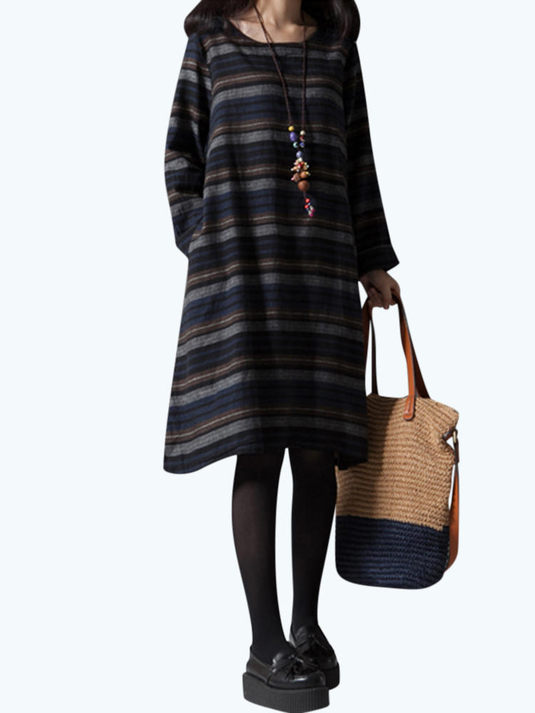 • Casual Women Long Sleeve Striped O-Neck Losse Jurk Met Zak