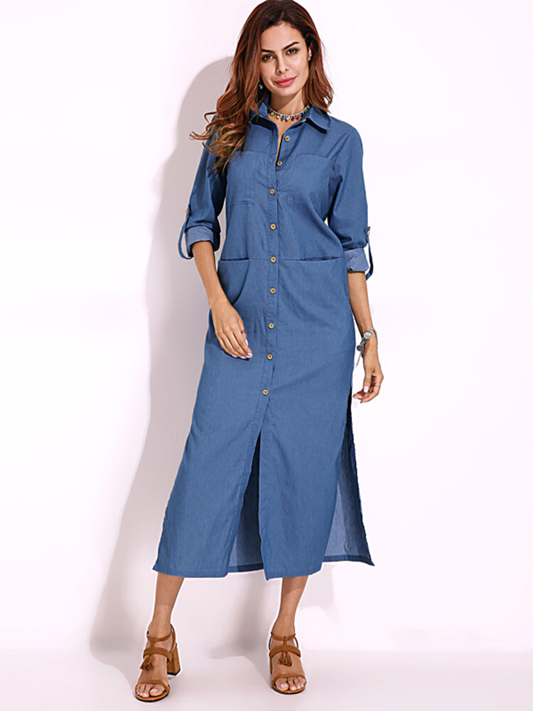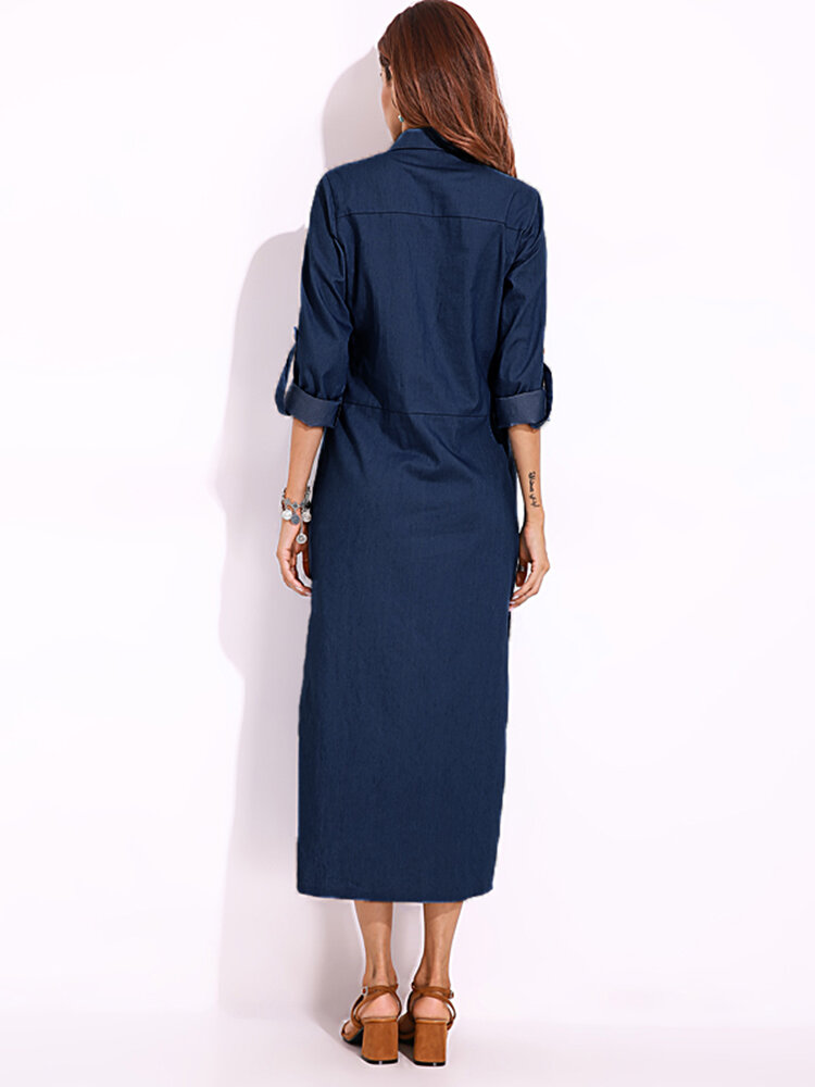 Elegante Women Down-Down Collar Long Sleeve Button Down Denim Shirt Dress
