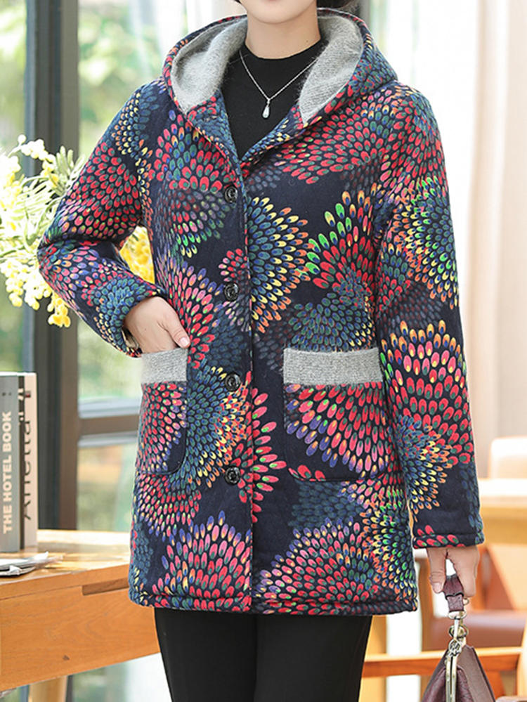 • Vintage dames bloemenprint patchwork-button lange mouwen hooded jassen
