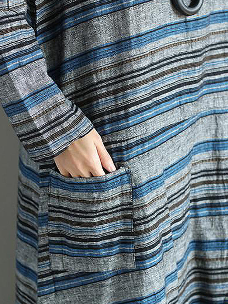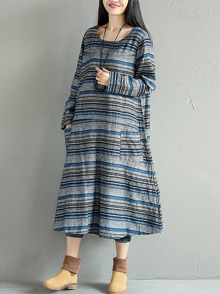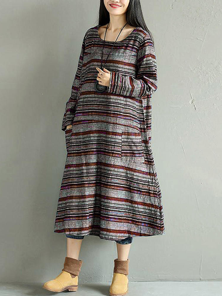• Vintage Vrouwen Lange Mouw Gestreept Scoop Neck Midi Jurk Met Zakken